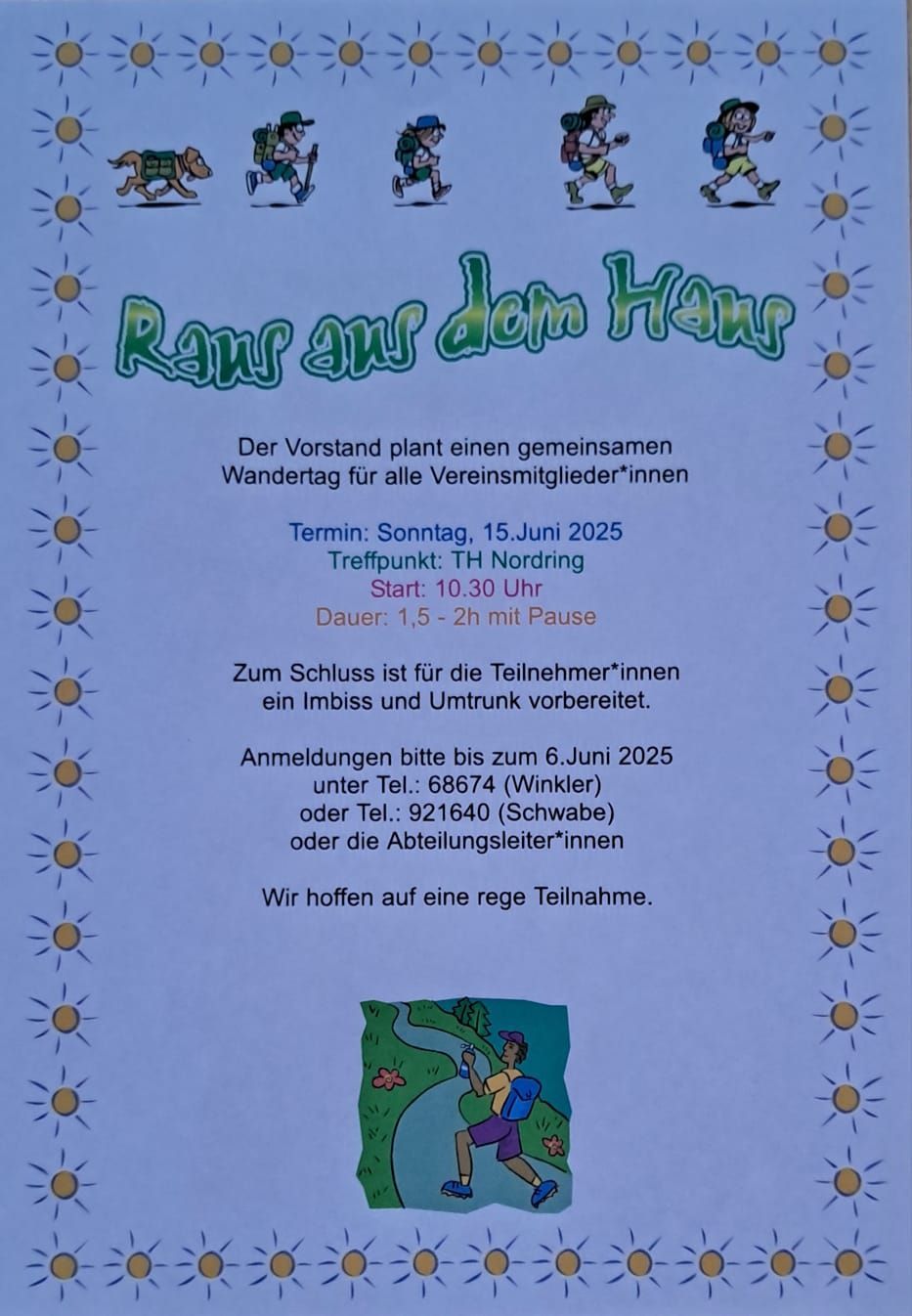 Unter dem Motto: Raus aus dem Haus, veranstaltet der Postsportverein Heiligenhaus 1956e.V. seinen Wandertag am Sonntag, den 15.06.2025. Start ist um 10:30 Uhr ab dem Treffpunkt an der Turnhalle Nordring. Ihr seit alle recht Herzlich eingeladen und hoffen mit Euch, auf eine rege Teilnahme.